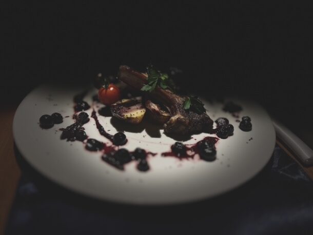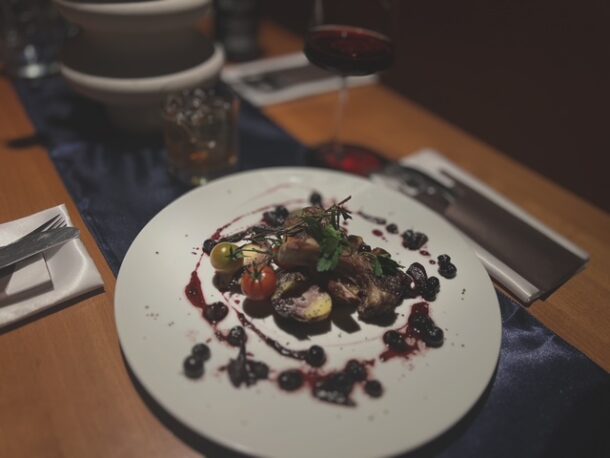 mit Rosmarin Kartoffeln, Heidelbeeren, Rotwein Sauce