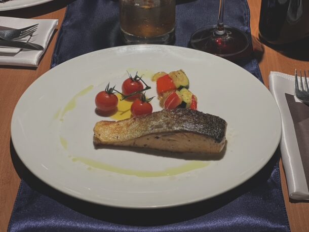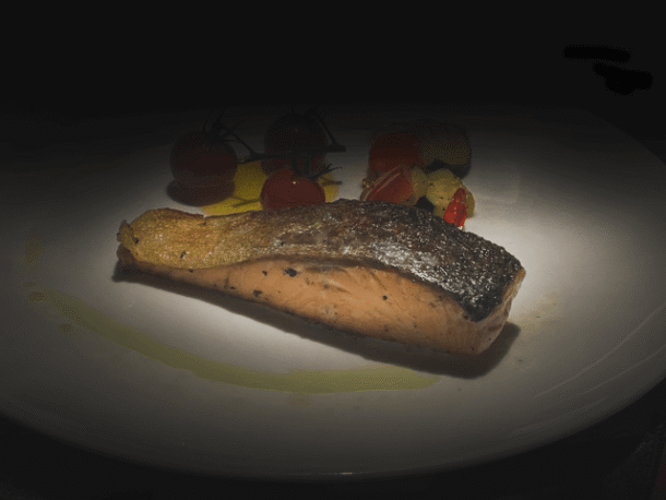 Glasig gebratener Lachssteak, Natives Olivenöl, Knoblauch, abgelöscht mit Weißwein